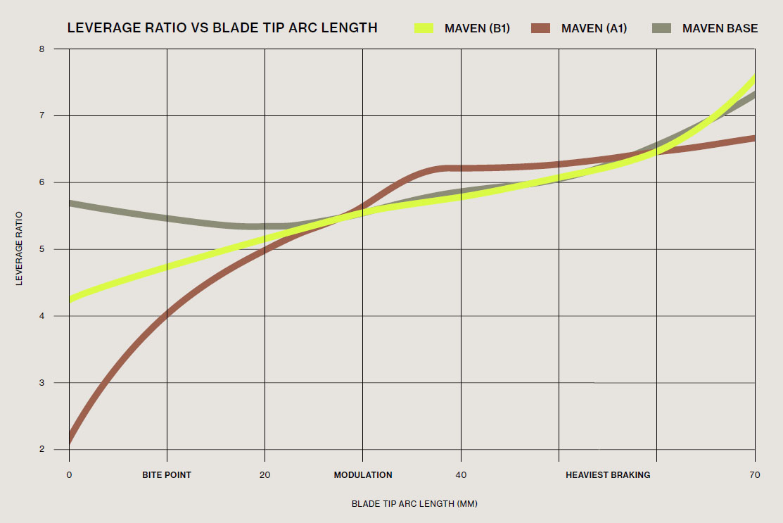 Maven nyní využívá přepracovanou křivku přepákování SwingLink, optimalizovanou pro plynulejší nástup brzdného výkonu a lepší modulaci. Vyšší počáteční pákový poměr slaďuje sílu potřebnou k stisku páky s verzí Maven Base a přináší intuitivnější ovládání. Tyto úpravy zachovávají špičkový brzdný výkon ve své třídě a zároveň poskytují jemnější kontrolu v prvních 25% chodu páky. Výsledkem je vyšší přesnost a jistota v rozbitém terénu nebo na povrchu s nízkou přilnavostí – přesně tam, kde příliš rychlý nástup výkonu může zhoršit kontrolu nad kolem.