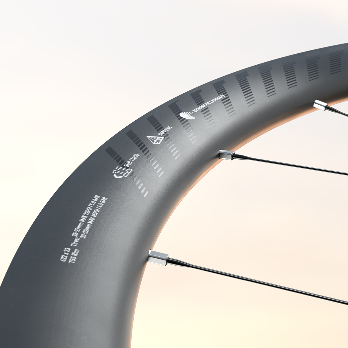 Vnitřní šířka ráfku 23 mm (TSS – Tubeless rovné patky) umožňuje použití širších plášťů a nižších tlaků. Ty minimalizují valivý odpor i ztráty způsobené vibracemi, šetří watty na cestě na vrchol a dávají jezdci rychlost i kontrolu ve sjezdu.