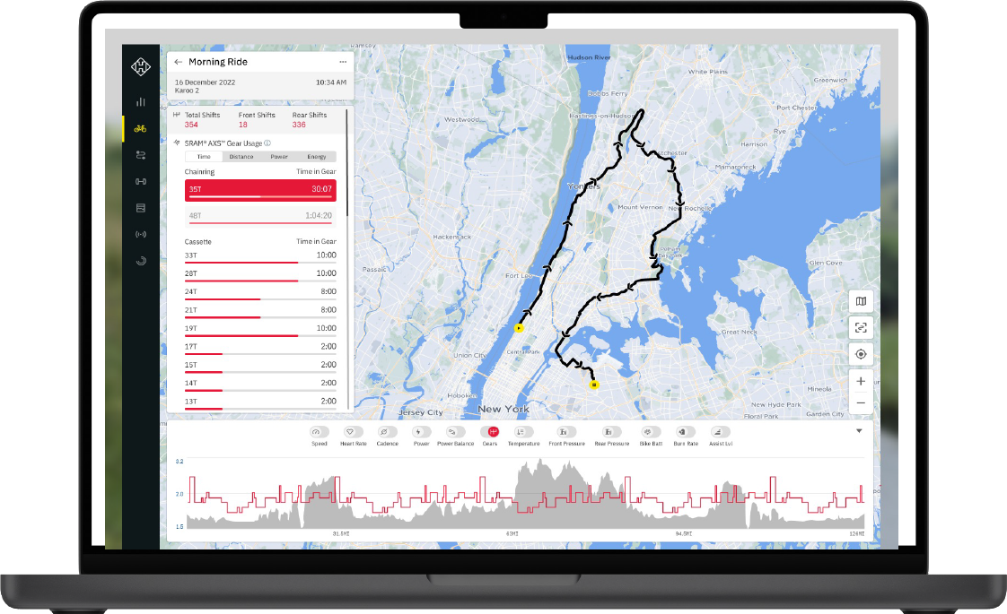 Karoo nabízí hlubokou integraci se systémem SRAM AXS. Na obrazovce tak máte přehled o:
