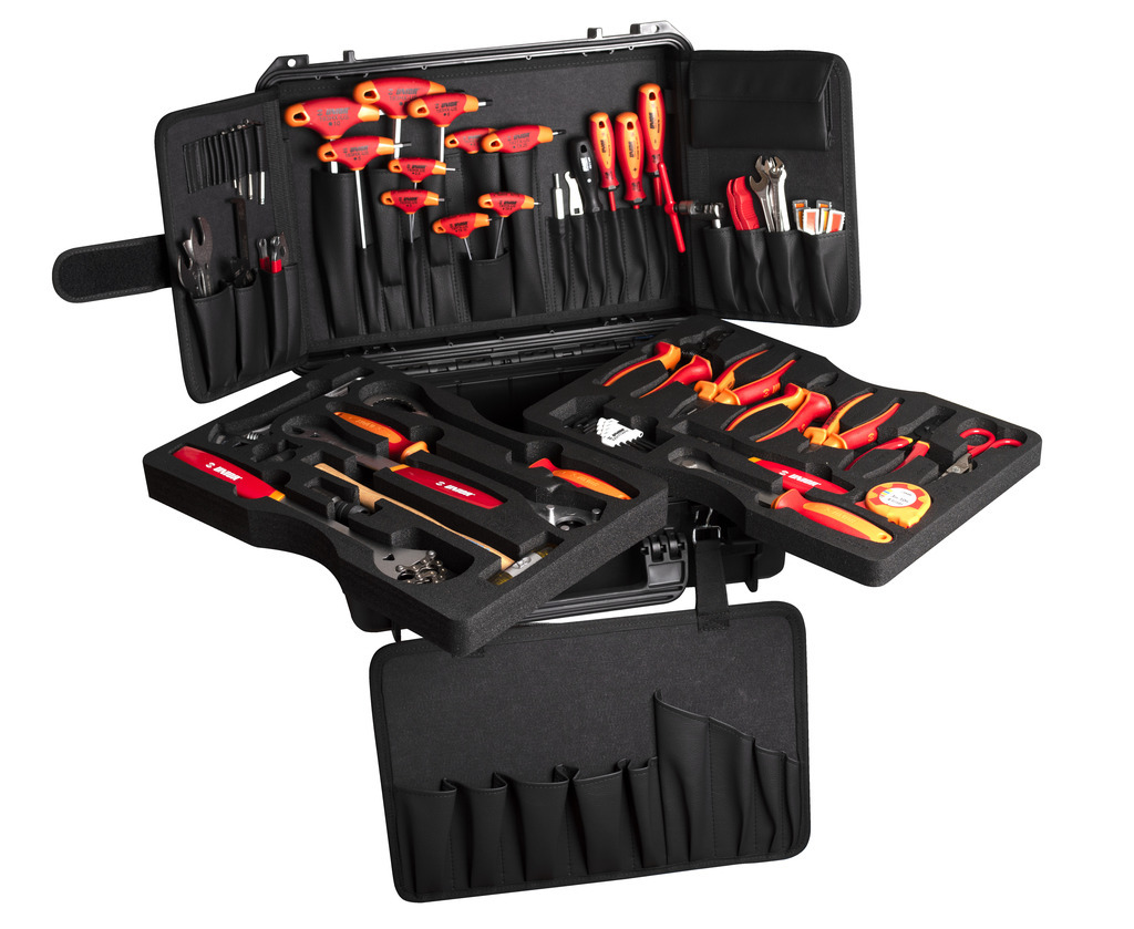Uvnitř víka jsou dva panely, které se bezpečně zavírají pomocí suchých zipů. Nejenže drží nářadí na místě během přepravy, ale zároveň nabízejí další úložný prostor. Po otevření vnitřních panelů a části víka odhalí 35 samostatných kapes pro širokou škálu nástrojů. Větší kapsy pojmou T-imbusové klíče až do velikosti 10, zatímco speciálně navržená malá kapsa bezpečně drží L-imbusové klíče až do velikosti 1,5, takže i ty nejmenší nástroje zůstanou pevně na svém místě.