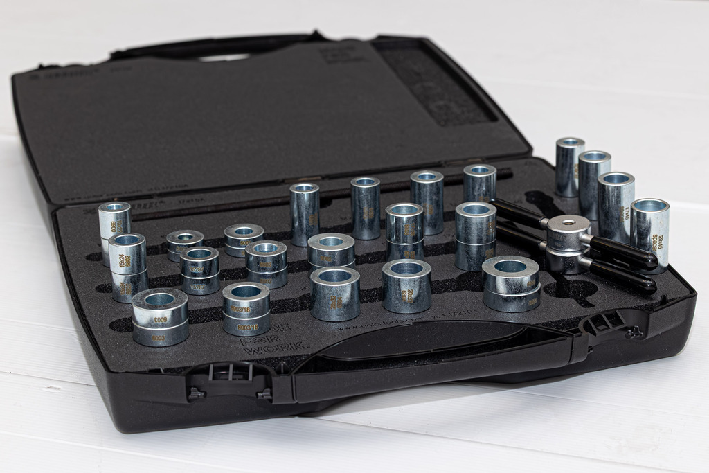 Sada je kompatibilní s širokou škálou běžně používaných nábojů s průmyslovými ložisky na trhu. Obsahuje dvě lisovací rukojeti se závitovou tyčí, adaptéry pro lisování ložisek přes osu a speciální distanční podložky pro pokrytí nejběžnějších kombinací os a ložisek.